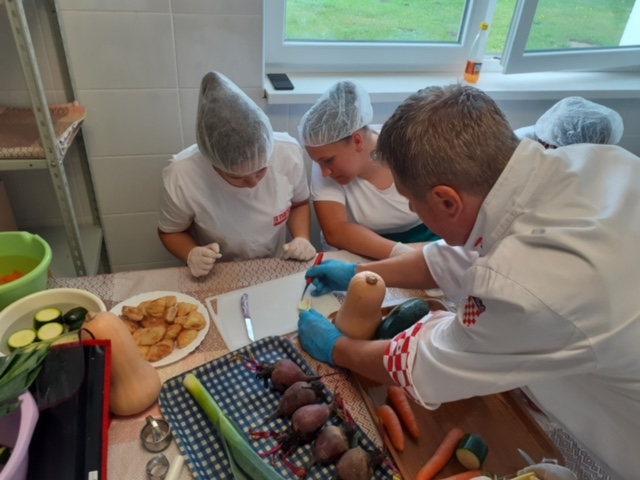 Cilj radionice, koju su pohađali učenici 2.d razreda smjer kuhar, bio je upoznati naše učenike s ovom disciplinom i naučiti osnovne tehnike obrade namirnica koje se mogu koristiti za dekoriranje svečanih stolova.