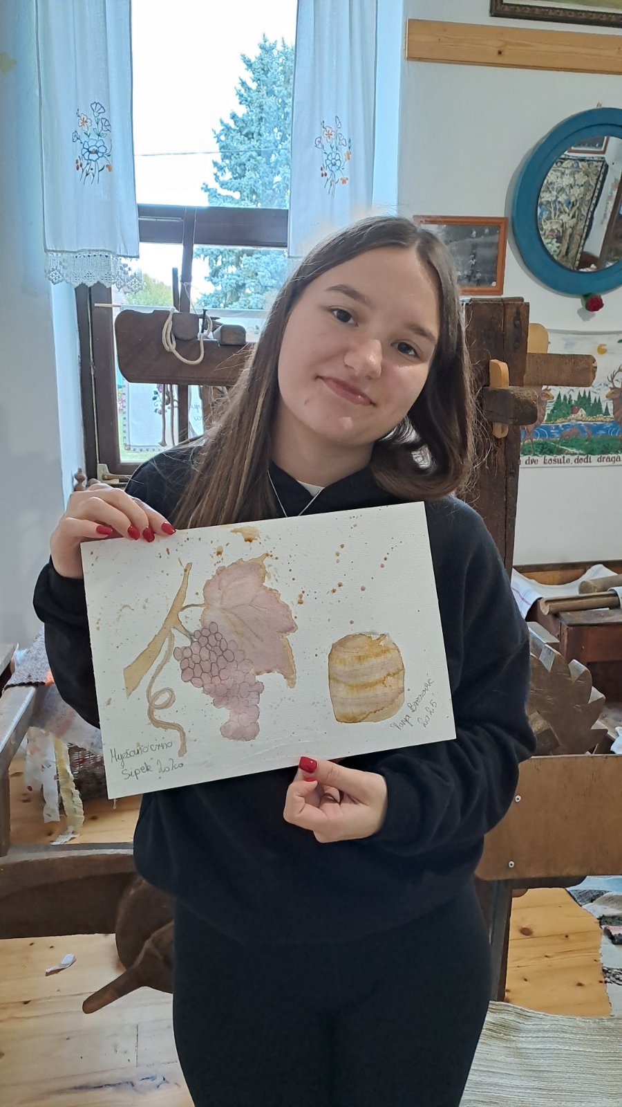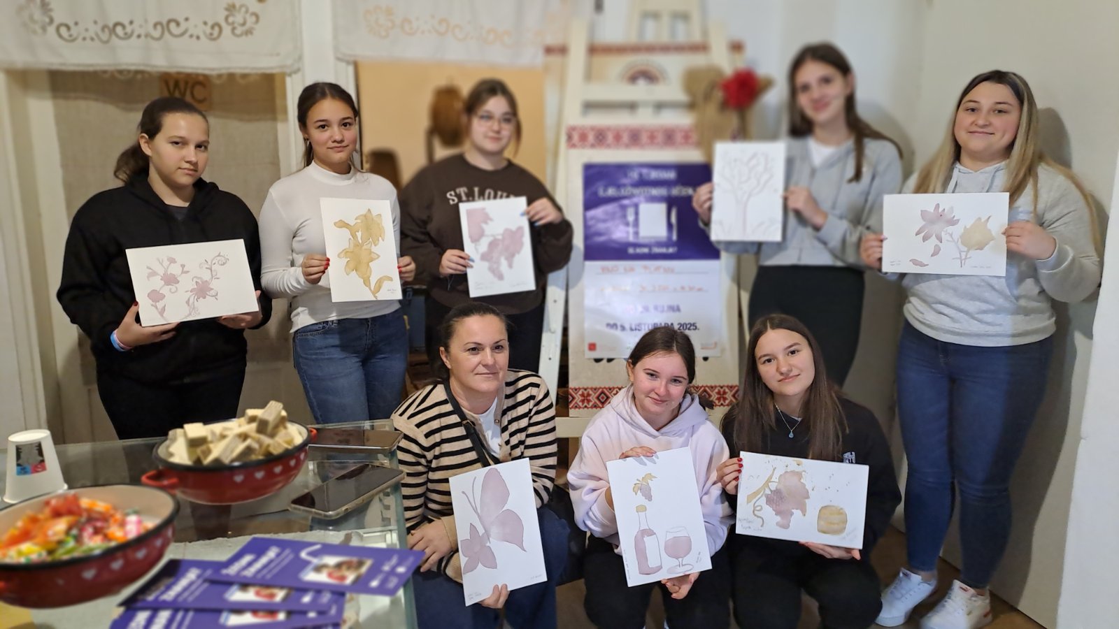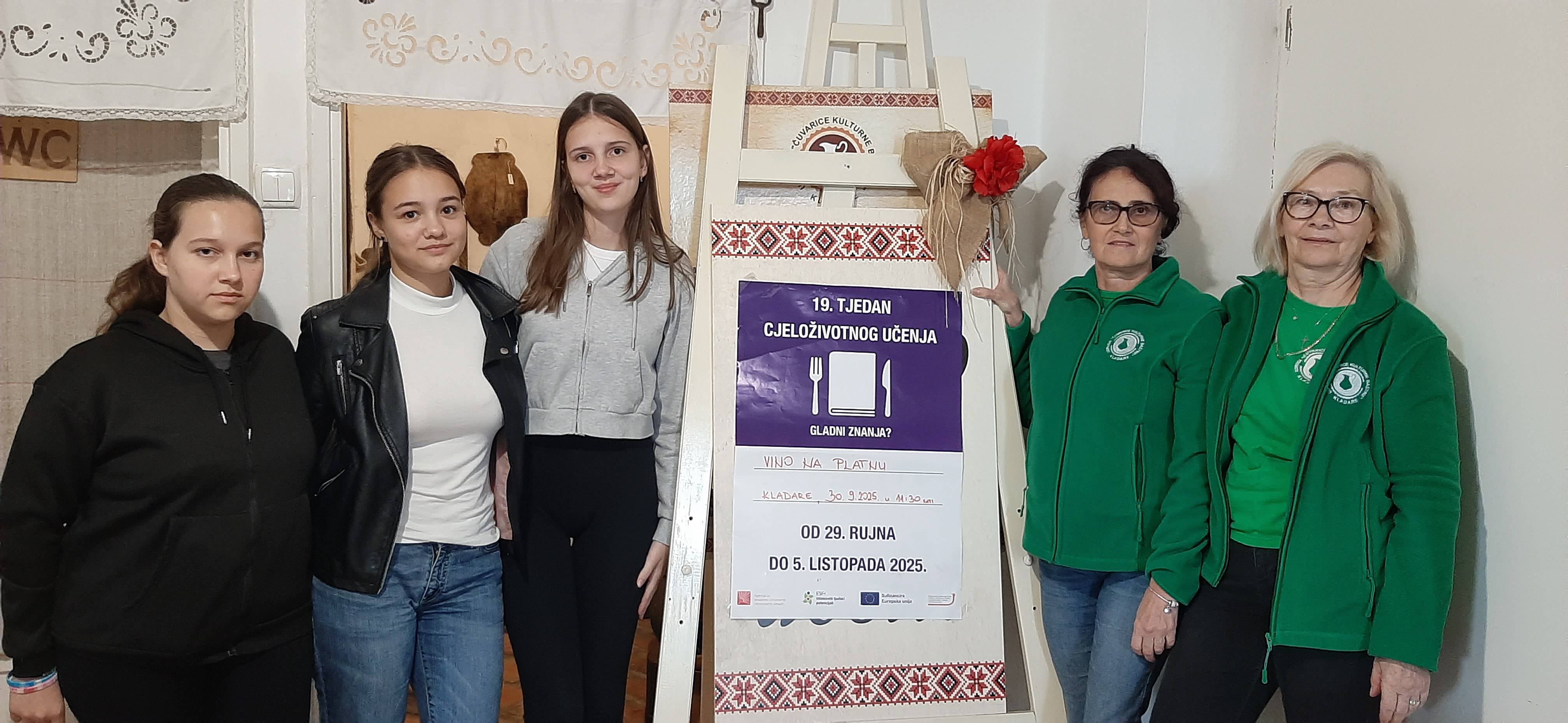 U sklopu nacionalne obrazovne manifestacije (19. Tjedna cjeloživotnog učenja) dana 30. 9. 2025. g. u Etno zbirci “Bakina priča” u Kladarama održana je jedinstvena radionica pod nazivom „Vino na platnu”, na kojoj su naši učenici imali priliku kombinirati likovno izražavanje i vinsku tematiku.